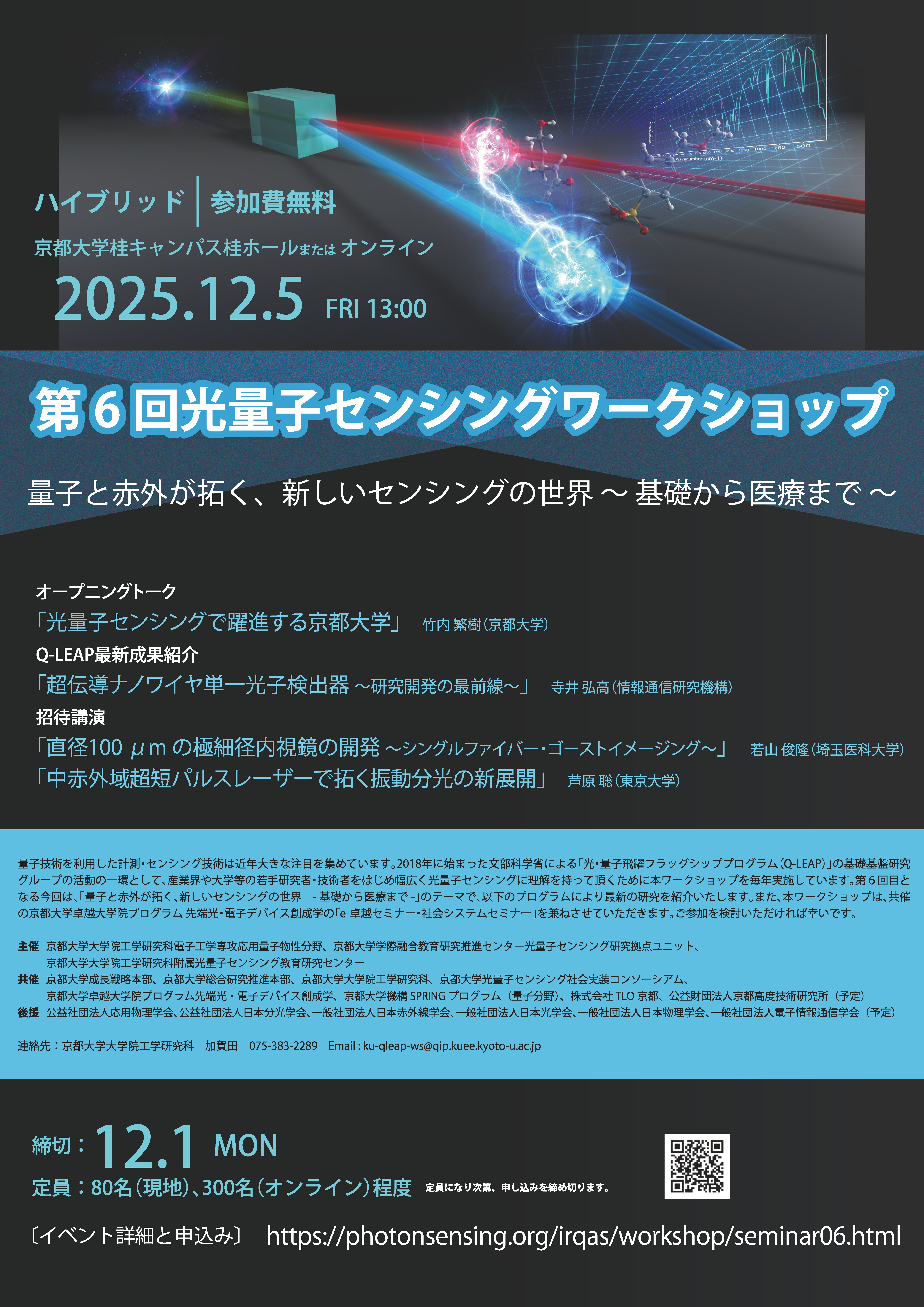 量子技術を利用した計測・センシング技術は近年大きな注目を集めています。2018年に始まった文部科学省による「光・量子飛躍フラッグシッププログラム(Q-LEAP)」の基礎基盤研究グループの活動の一環として、産業界や大学等の若手研究者・技術者をはじめ幅広く光量子センシングに理解を持って頂くために本ワークショップを毎年実施しています。第6回目となる今回は、「量子と赤外が拓く、新しいセンシングの世界 - 基礎から医療まで -」のテーマで、以下のプログラムにより最新の研究を紹介いたします。また、本ワークショップは、共催の京都大学卓越大学院プログラム 先端光・電子デバイス創成学の「e-卓越セミナー・社会システムセミナー」を兼ねさせていただきます。ご参加を検討いただければ幸いです。