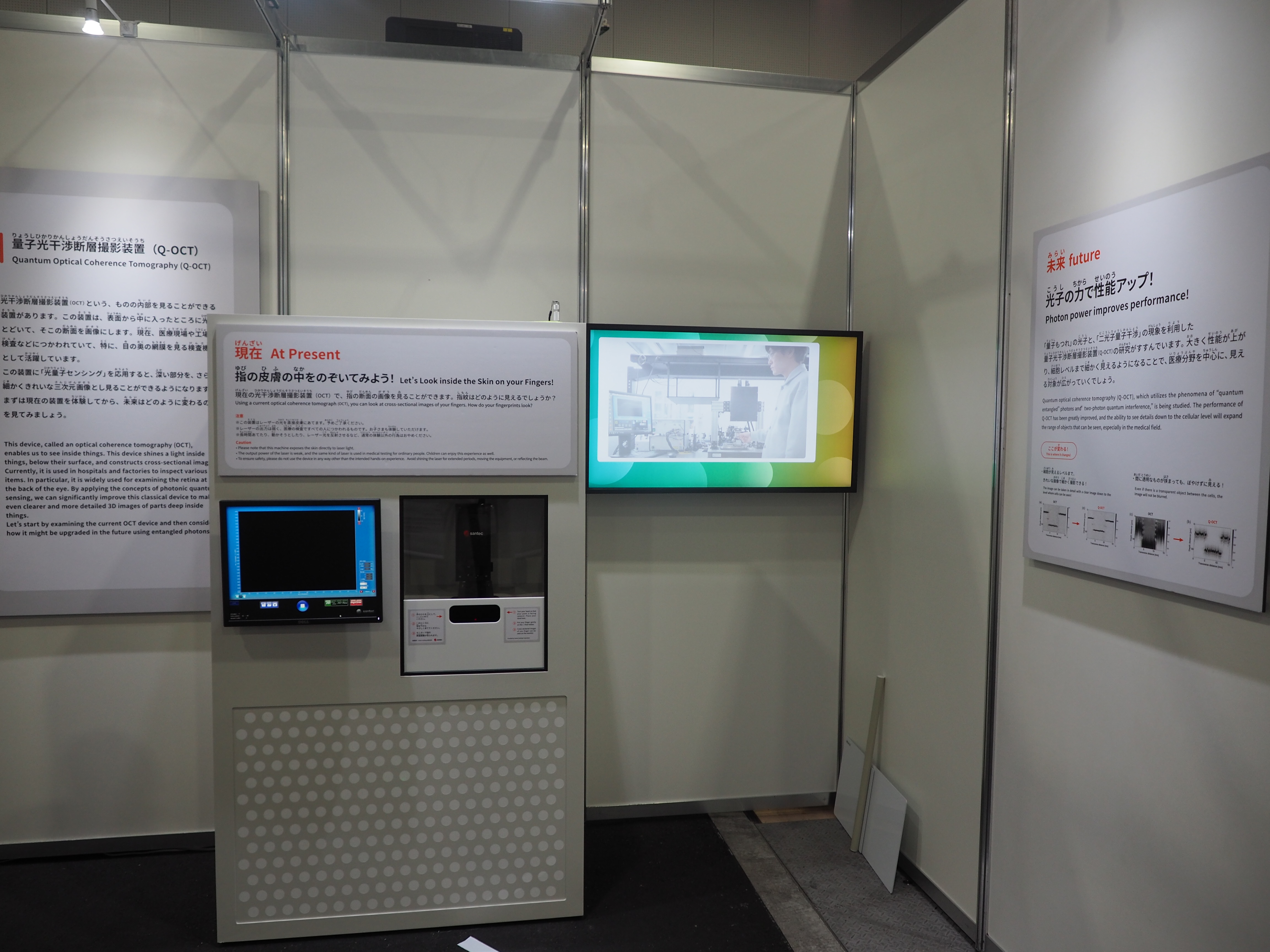 来場者に、OCT装置を用いて自分の指の内部を観察できることを体験してもらい、量子もつれ光を用いたQ-OCTにより分解能が大きく向上できることを、解説映像と測定データを通じて説明します。
